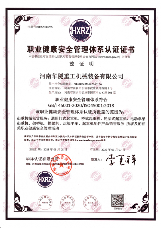 河南華隧重工機械裝備有限公司主要從事通用門式起重機、橋式起重機、電動單梁起重機,輪胎式起重機、架橋機、提梁機、遠梁平車、鋼絲繩電動萌蘆、卷揚機、起重配件制造、銷售:起重機械租賃、安裝和維修,起重設(shè)備園收,機械設(shè)備維修,鋼結(jié)構(gòu)工程承包,橋梁工程及技術(shù)咨淘服務(wù),銷售五金制品、機電設(shè)備:建設(shè)工程監(jiān)理,建設(shè)工程設(shè)計,各類工程建設(shè)活動,建筑勞務(wù)分包,建筑物折除作業(yè),施工作業(yè),工程管理服務(wù),土石方工程施工,裝如發(fā)運。  公司已通過IS0國際質(zhì)量、環(huán)境、健康與安全三合一標準認證,特種設(shè)備制造許可證和特種設(shè)備安裝改造維修許可證。擁有完熟的質(zhì)量管理體系。嚴格的管理制度,強大的生產(chǎn)能力和先進的檢測手段,在保證產(chǎn)品質(zhì)量的同時,也具備了極強的市場競爭力。  公司堅持科技創(chuàng)新為理念,產(chǎn)品質(zhì)量為核心,注重信譽,建立了減信可靠、快捷、思速。便利周到的售后服務(wù)網(wǎng)絡(luò)。  我們擁有的技術(shù)專家和技術(shù)服務(wù)隊伍為客戶提供充善的售前技術(shù)支持和全天候的售后服務(wù)體系,讓您無后顧之憂,享受一站式的超值服務(wù)。  “華隧重工,伴您成功“是華隧重工永遠的宗指,真被的希望與各界朋友攜手并進。共創(chuàng)輝準!